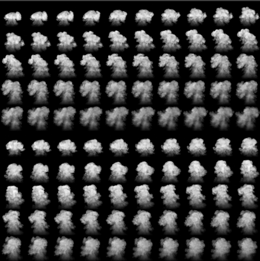 - To create the variety of plume shapes I was going for I rendered 2 flipbooks that serve the same purpose, have a similar enough silhouette but not so similar that they’re redundant. I managed to fit two 10×5 flipbooks into one texture, and with the help of motion vectors it almost looks smooth, but in the end I wish I had a few more frames.