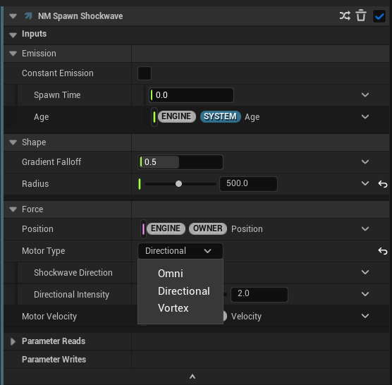 Niagara systems could inject velocity into the field through a custom Niagara module. It had all the usual settings that one might expect – radius, intensity, origin position and supported omnidirectional, directional and vortex emitter types.